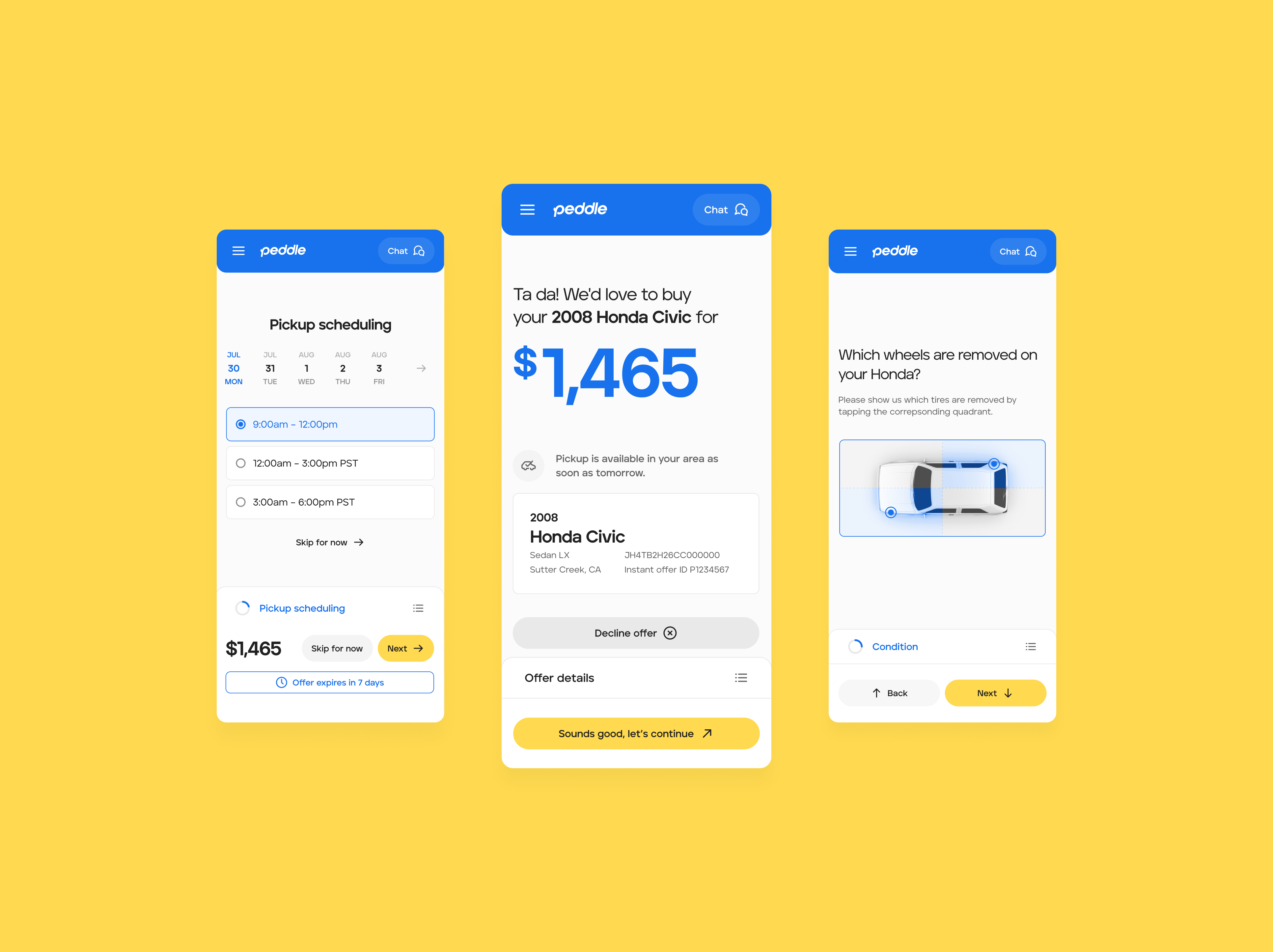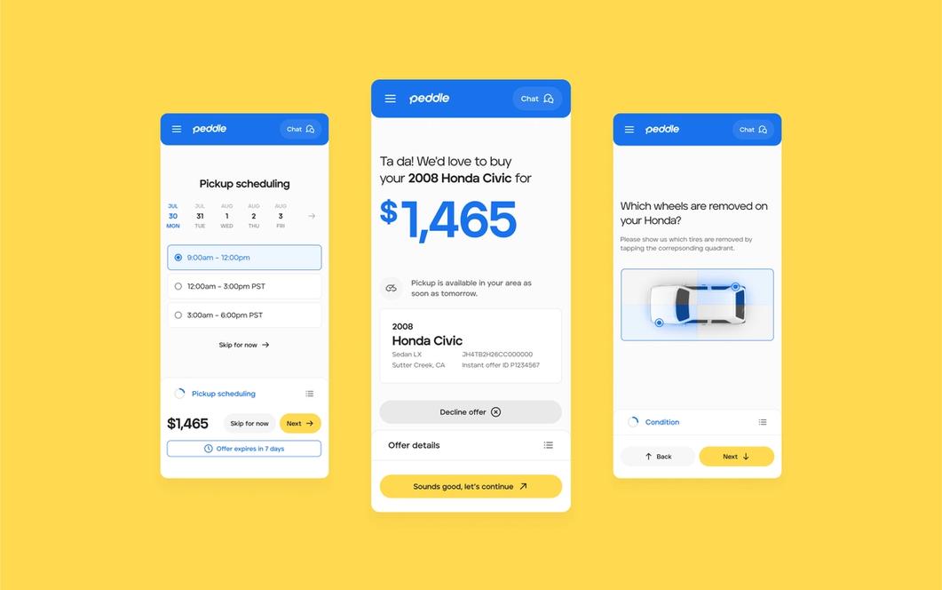 It ain't no thing but a chicken wing when it comes to cashing in your car with Peddle. One big reason why we make it so easy is that we're in the market for any car. Especially ones on their last leg or have no legs at all. If the dashboard has more blinking lights than a house during Christmas, we'll buy it. If it has trash bags for windows with no brakes, tell us where to sign. On top of loving to buy jalopies, we make selling your car easier than selling umbrellas in a rainstorm. For starters, getting a legit offer only takes a couple of minutes.